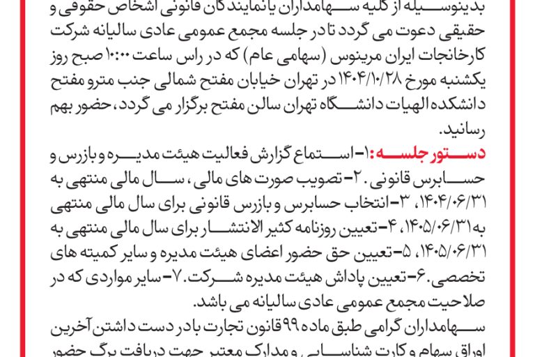 به موجب آگهی چاپ شده در روزنامه اطلاعات مورخ 1404/10/17 مبنی بر دعوت به مجمع عمومی عادی سالیانه کارخانجات ایران مرینوس (سهامی عام) در تاریخ 1404/10/28 راس ساعت 10:00 در محل تهران، خیابان مفتح شمالی، جنب مترو مفتح، دانشکده الهیات دانشگاه تهران سالن مفتح برگزار خواهد شد. همچنین مجمع فوق همزمان به صورت آنلاین از…